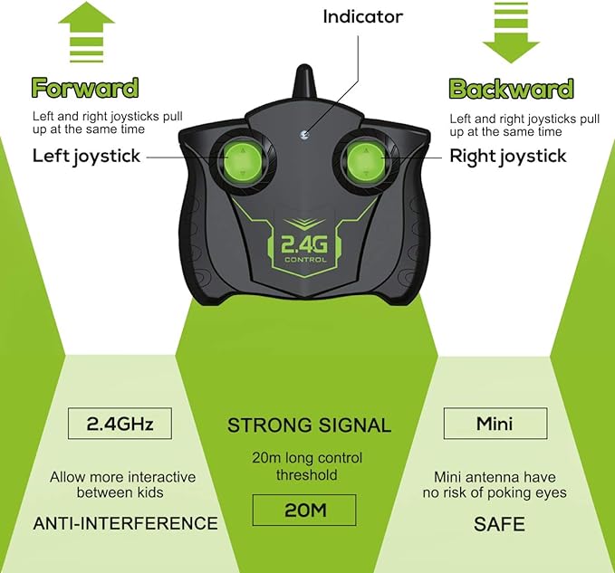 🌟 Amazing Stunt Design: Experience the thrill of incredible stunts with the VAZILLIO stunt car! It can perform forward, backward, left, and right turns, as well as impressive 180 flips and 360 rotations. Pushing the 2 joysticks toward opposite directions results in a fast rotating motion resembling an inverted cone of light. With a maximum speed of 9mph, the excitement never ends.